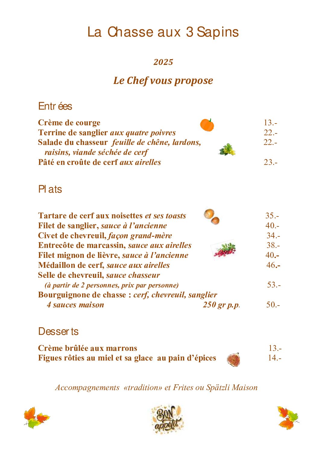 Retrouvez chaque semaine les menus du jour. Entrée, plat et dessert aux prix de 22.- la semaine et 34.- le dimanche.